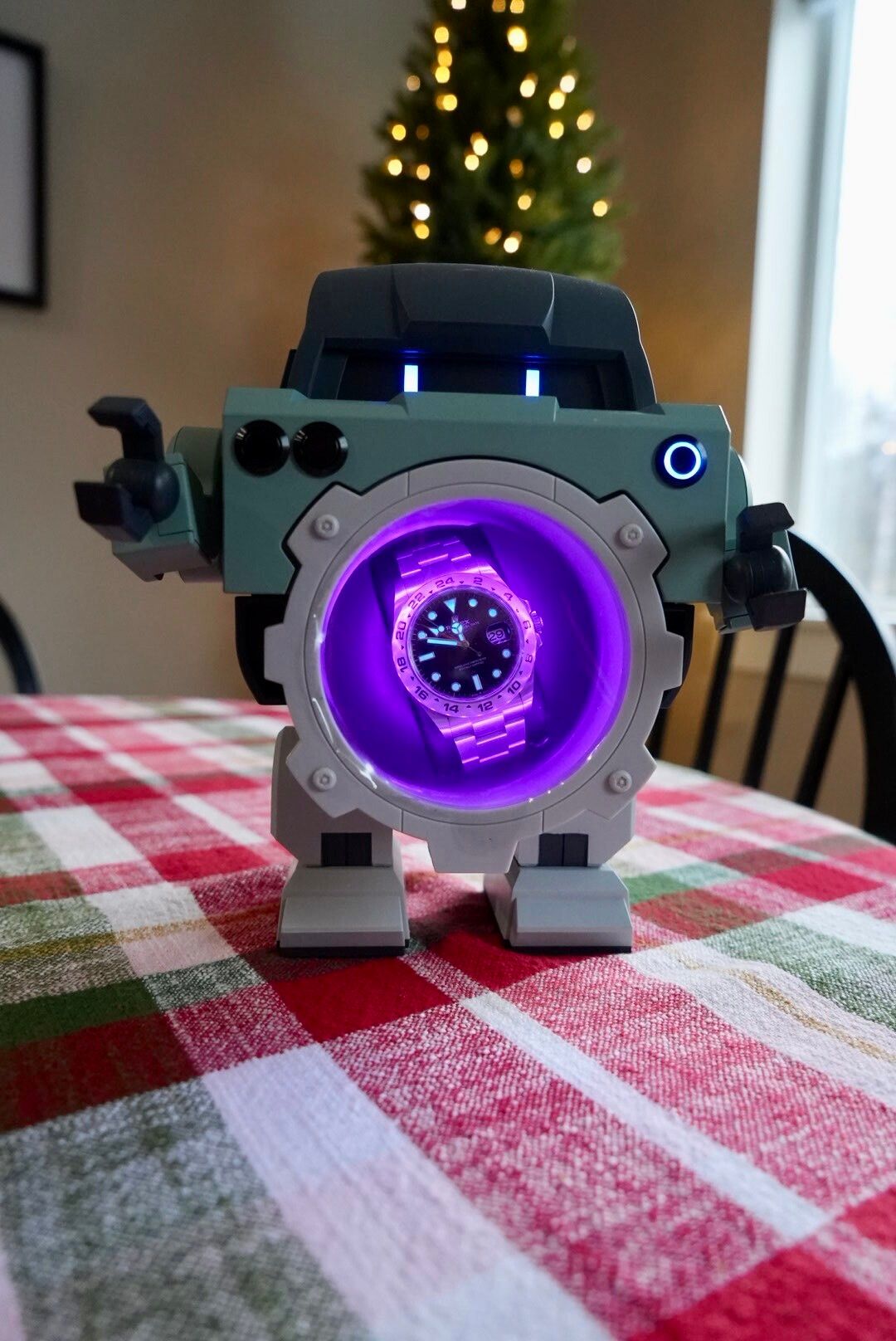 One of the RW1's standout features is the internal UV lume charger, and I'm pleased to report it actually works exceptionally well. Not only does it charge your watch's luminous markers effectively, but it also creates fantastic ambiance lighting. Watching your watch glow inside the robot housing is genuinely cool and adds to the overall experience of owning this piece.